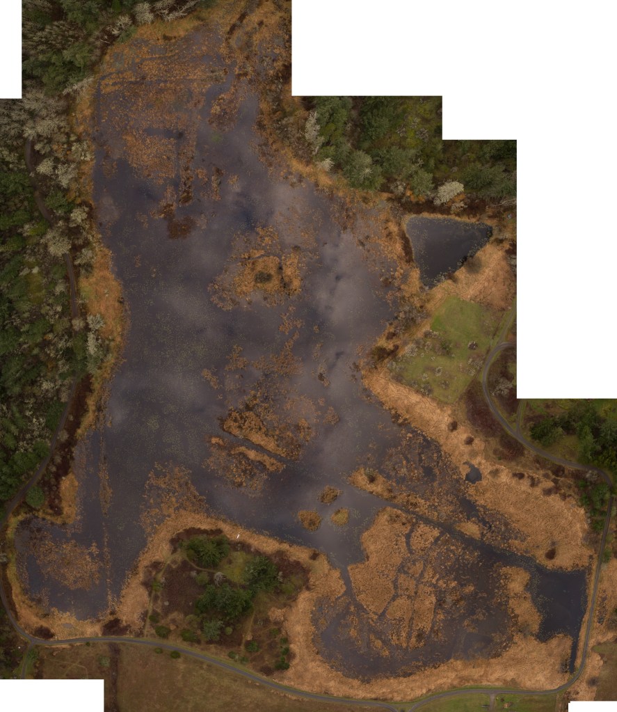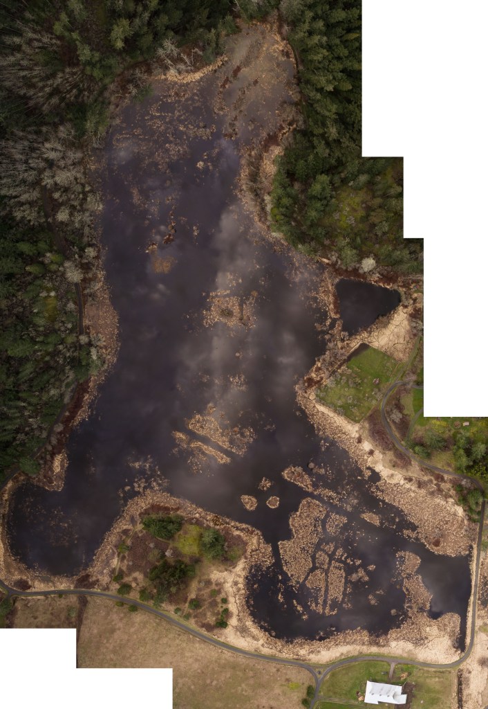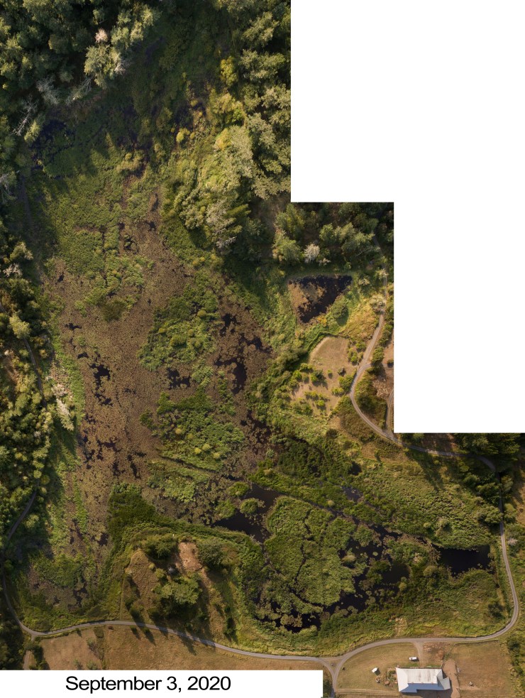 Aerial view on February 17, 2020 at the maximum water level in a winter with plentiful rainfall. Water level 6.61 ft. Image by Randall Tate. Aerial view of the 3M marsh on November 25, 2019 at low water level following a few years of low water levels with no blocks in the weir. Water level 4.11 ft. Image by Randall Tate. Aerial view of Three Meadows marsh, approximately 2012-2013.